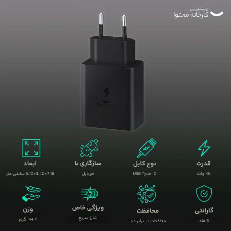 تعداد درگاه خروجی 1 عدد نوع درگاه خروجی USB-C توضیحات در ادامه لیست دستگاههای سامسونگی که این سوپر فست شارژر 45 واتی را پشتیبانی میکنند= - Samsung Galaxy S10 5G - Samsung Galaxy S10e - +Samsung Galaxy S10 - Samsung Galaxy S10 - Samsung Galaxy Note10 - +Samsung Galaxy Note10 - Samsung Galaxy Note10+ 5G - Samsung Galaxy Note10 Lite - Galaxy Note20 - Samsung Galaxy Note20 Ultra - Samsung Galaxy S20 - +Samsung Galaxy S20 - Samsung Galaxy S20 Ultra - Samsung Galaxy S20 Ultra 5G - Galaxy S20 FE - Samsung Galaxy S20 FE 5G - Samsung Galaxy S21 - Samsung Galaxy S21 Ultra - Samsung Galaxy A70 - Samsung Galaxy A70s - Samsung Galaxy A80 - Samsung Galaxy A90 5G - Samsung Galaxy Z Flip - Samsung Galaxy Z Fold2