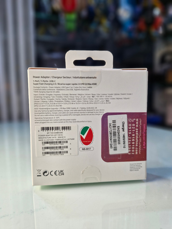 شارژر اصلی سامسونگ سوپر فست 45 وات مدل Travel Adapter Super Fast 45W Type-C (EP-TA845) شارژر 100 درصد اصلی و اورجینال سامسونگ میباشد. این محصول ساخت ویتنام میباشد. شارژر دیواری(EP-TA845) محصول شرکت سامسونگ است. این شارژر دیواری دارای فناوری PD 3.0 است که با استفاده از آن می توانید دستگاه خود را با سرعت بیشتر و با توان 45 وات شارژ کنید. شدت جریان خروجی این شارژر برابر با 5 آمپر است که می توان از آن برای شارژ کردن تبلت هم استفاده کنید. برای این شارژر از چیپ هوشمندی استفاده شده تا با اتصال دستگاه به صورت خودکار جریان مناسب را برای دستگاه تامین کند. درگاه خروجی این محصول هم از نوع USB-C است. البته همراه با این شارژر یک کابل تبدیل USB-C به USB-C به طول 1.8 متر هم ارائه میشود. این شارژر سایر محصولات و موبایل های سری 2019 به بالا و گوشی هایی که توانایی شارژ سوپرفست را دارند پشتیبانی می کند.