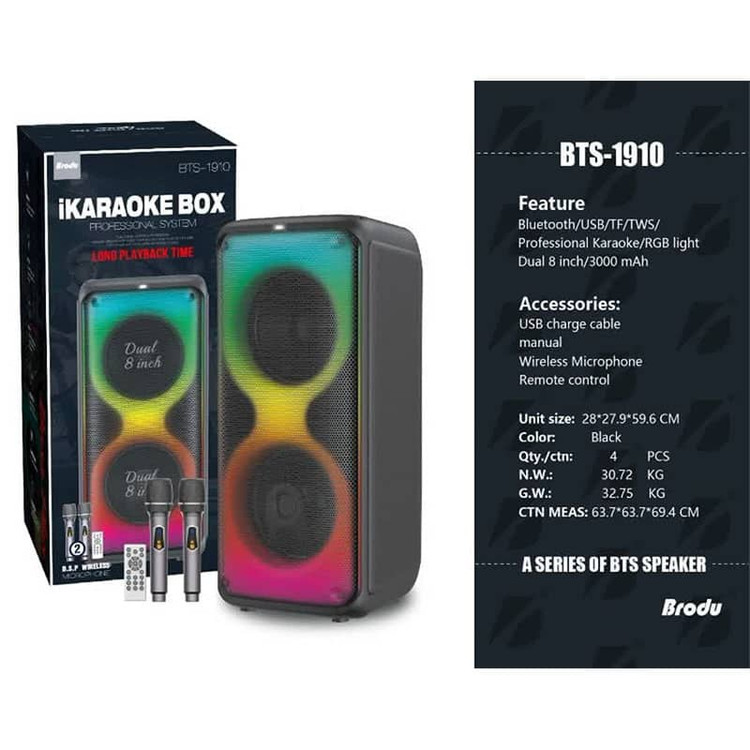 اسپیکر شارژی و قابل حمل 1910یکی از پر فروش ترین محصولات شرکت bts می باشد که طراحی فوق العاده این اسپیکر وجه تمایزی بر بقیه محصولات این شرکت شده است.این دستگاه شامل دو عدد ساب 8 اینچ و یک تیوتر 1 اینچ می باشد که هرکدام با توان 50 وات rms میتواند صدایی فوق العاده بلند و با کیفیتی را تولید کند. طراحی و ساختار دینامیک استوانه ای این محصول به جذابیت مثال نزدنی آن چندین برابر افزوده است.همچنین این دستگاه از تمام امکانات مولتی مدیا نظیر بلوتوث،فلش،مموری، ای یو ایکس و... پشتیبانی کرده .
